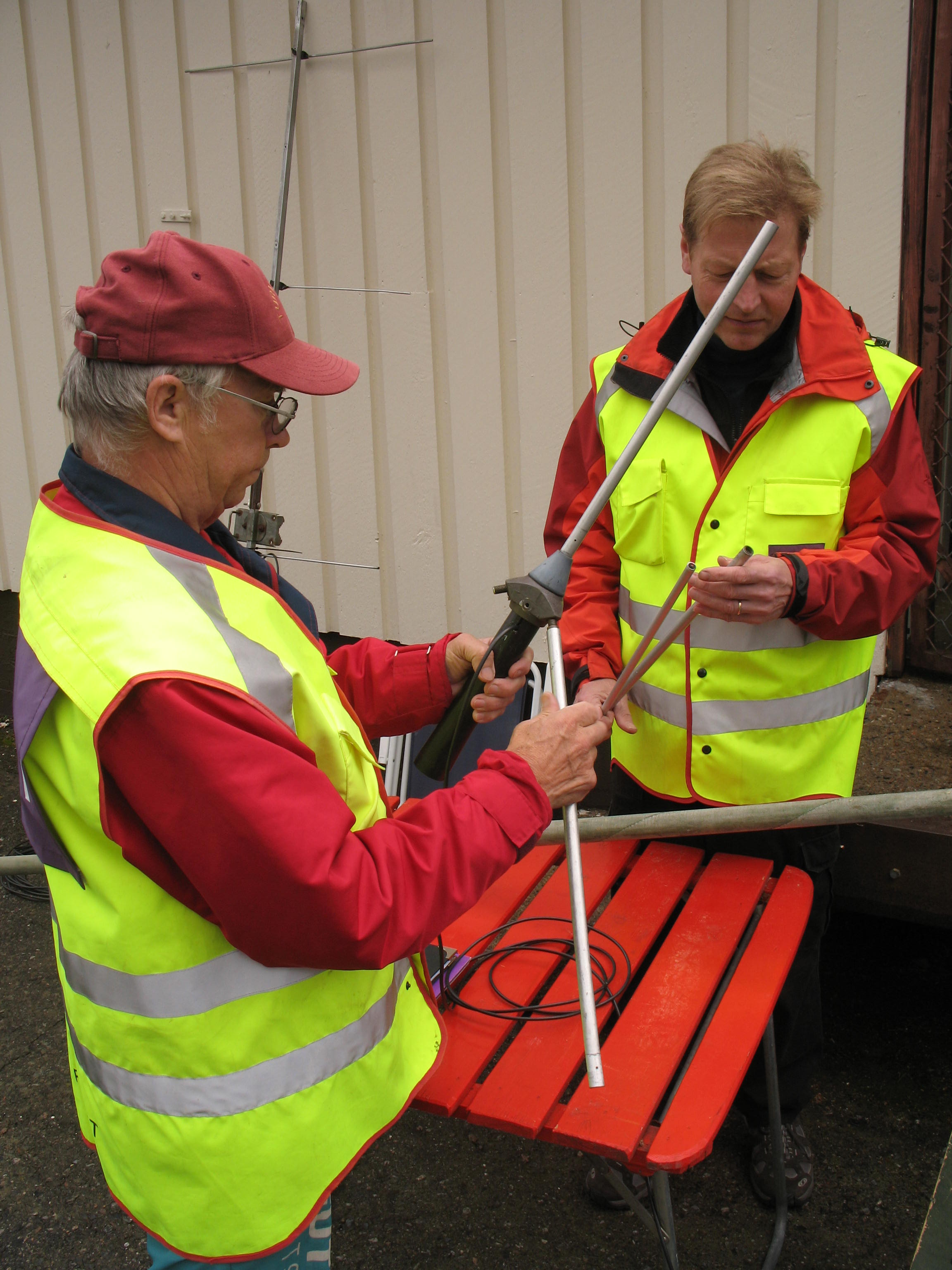 Kuvaus: Ympärisäteilevä GP antenni tehtiin vanhoista teltan alumiiniputkista. Kokoamassa Alpo OH7VL ja Markku OH7NQI Ympärisäteilevä GP antenni tehtiin teltan putkista. OH7VL ja OH7NQI