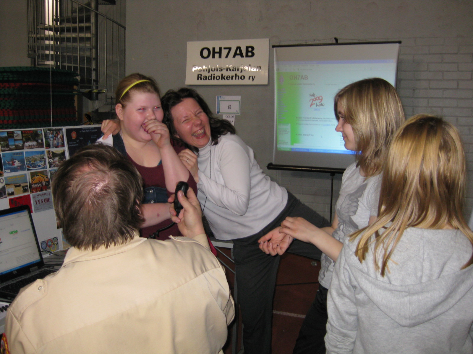 Itä-Suomen Koulun tytöt nauttivat opettajansa kanssa. Sveitsissä asuva suomalainen Heikki HB9EDY oli innokkasti mukana ja toimi vasta-asemana monissa yhteyksissämme. Kiitos Heikki ! Iloinen joukko Itä-Suomen koulusta. Vasta-asemalla Sveitsissä oli taito hyppysissä.. Heikki HB9EDY osasi jututtaa tyttöjä radion välityksellä.