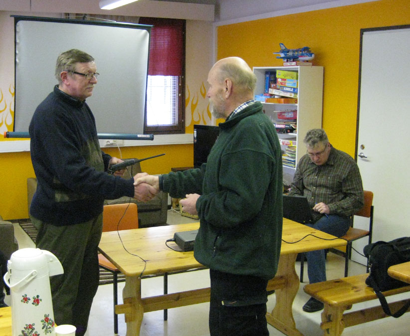 Simo lahjoittaa kerholle 2m kasiradion. Kerhon puheenjohtaja Pentti Malinen OH7MP kiittää.